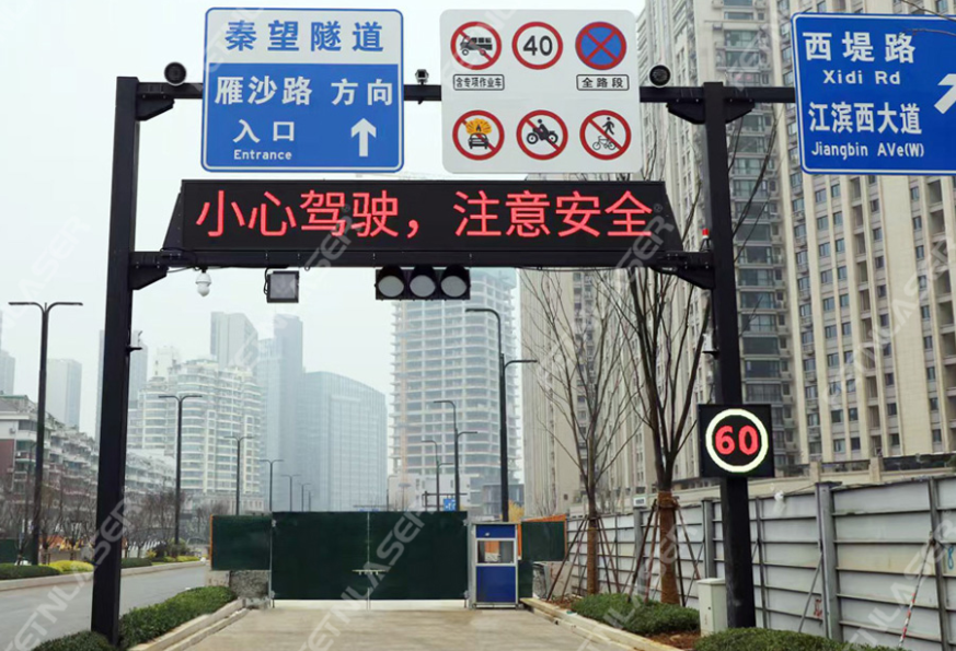 针对以上安防难点,飞天光电推出的第二代激光雷达超高检测器,以毫米级精度与智能算法为核心,构建了“检测-预警-抓拍-联动”的全流程防控体系:通过将激光探测设备安装道路一侧,依据限定高度设立一条垂直于路面的“无形”的激光警戒线,实现对过往车辆分车道超高检测预警,并联动对应车道卡口相机进行抓拍取证,同时联动现场LED诱导屏、声光警号等设备对超高车辆进行警告和安全引导。