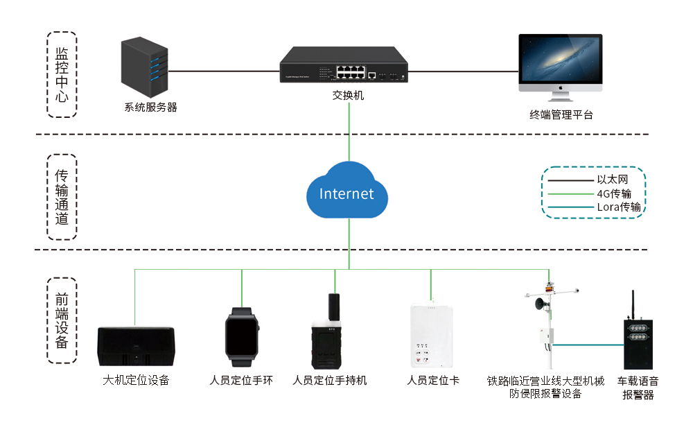 针对大型机械作业特点,可自主更换报警语音提示内容,当设备触碰安全防线时,车载语音与警示灯同步报警,确保操作员第一时间获取预警信息。并向后台软件发送防区状态,配合高清摄像头视频取证,实现对铁路沿线作业施工防侵限活动,对靠近铁路沿线施工的大型机械进行侵限监测。