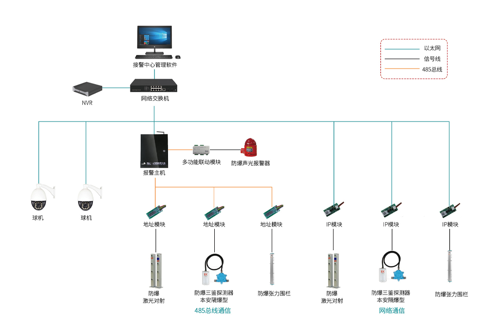 整套系统依托报警主机或管理平台,对前端防爆探测器实施24小时实时监测,精准采集探测器的报警信号及状态数据。在各防区关键位置部署防爆声光警号装置,当触发警情时,系统可自动联动警号发出强声强光报警信号,并同步调用视频监控设备进行现场画面捕捉,实现“报警-提示-取证”一体化响应。这种联动机制既能通过声光信号快速警示现场人员,又能通过视频画面实时核查真实性,确保安全管理人员在第一时间掌握现场动态,有效提升应急处置效率与安全防护可靠性。