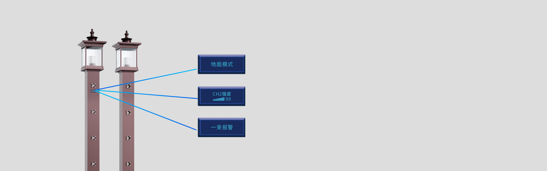 落地式景观灯激光对射入侵探测器专为空旷区域防范而设计,可广泛应用居民住宅区、高档别墅、社区、政府园区、文博馆等高端周界防范领域,以及高校、小区、工厂等民用周界防范领域。